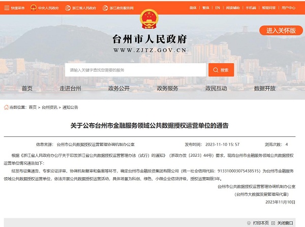 11月10日,臺州市政府與市金投集團簽訂《公共數(shù)據(jù)授權運營協(xié)議》,標志著市金投集團成為臺州首家公共數(shù)據(jù)授權運營單位,依法開展科創(chuàng)、綠色和小微普惠場景公共數(shù)據(jù)授權運營活動。