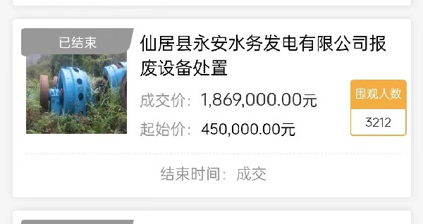 自統(tǒng)一全市國(guó)有資產(chǎn)公開交易平臺(tái)以來,11月20日,仙居首宗項(xiàng)目——仙居縣永安水務(wù)發(fā)電有限公司報(bào)廢設(shè)備處置成功高溢價(jià)成交。該項(xiàng)目起拍價(jià)45萬元,經(jīng)573輪次競(jìng)價(jià),最終成交價(jià)186.9萬元,溢價(jià)率高達(dá)315.33%,創(chuàng)下2023年以來新高。