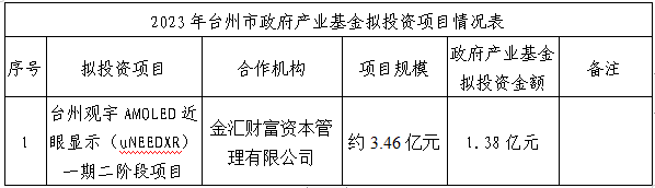 根據(jù)《臺州市政府產(chǎn)業(yè)基金管理辦法》(臺財企發(fā)〔2021〕6號)等有關規(guī)定,為發(fā)揮政府產(chǎn)業(yè)基金引領作用,臺州市政府產(chǎn)業(yè)基金擬投資的1個項目(定向基金),已由臺州市金融投資集團有限公司決策委員會(基金管理委員會)審議通過,現(xiàn)將擬投資項目予以公示。如有意見,可向市金投集團反映。