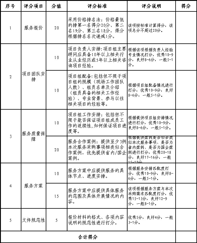 采用綜合比選方式,總得分為100分。根據評審結果,從高到低選擇1家服務供應商作為本次采購服務的合作機構。