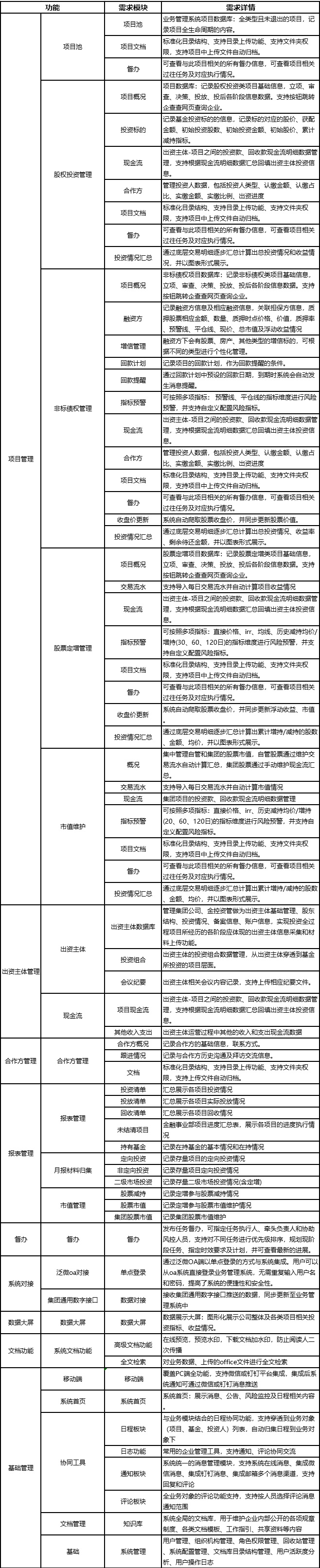 1.應(yīng)答方需根據(jù)我司現(xiàn)有的業(yè)務(wù)類(lèi)型和管理模式等要求,開(kāi)發(fā)一款適合我司的資管業(yè)務(wù)管理系統(tǒng)。系統(tǒng)具體需要實(shí)現(xiàn)的功能詳見(jiàn)下表: